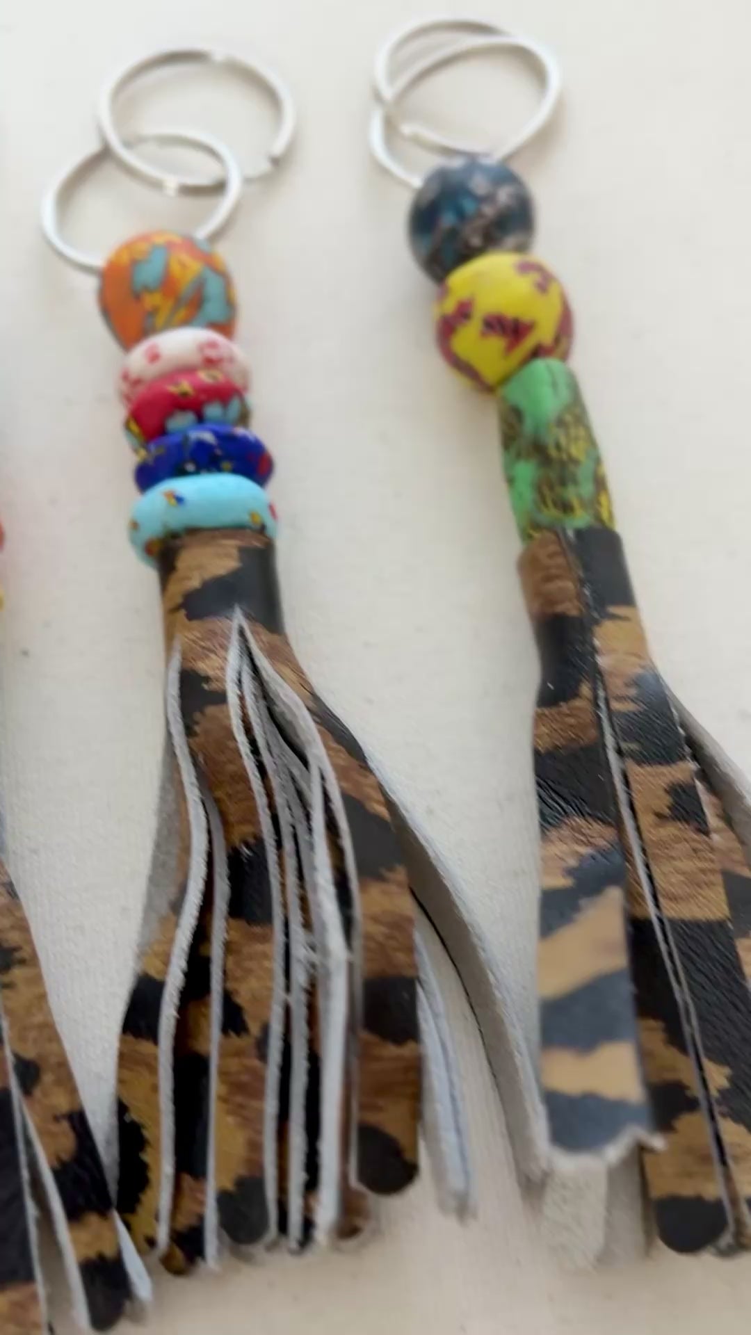 Our recycled glass beads, leather and Lost wax brass keychains. Sold in a variety of colorful Ghana trade beads.
