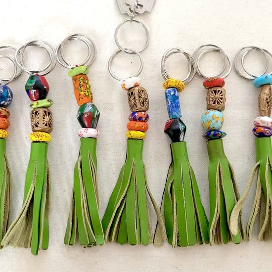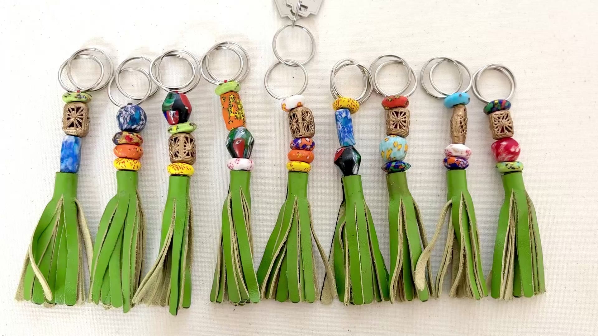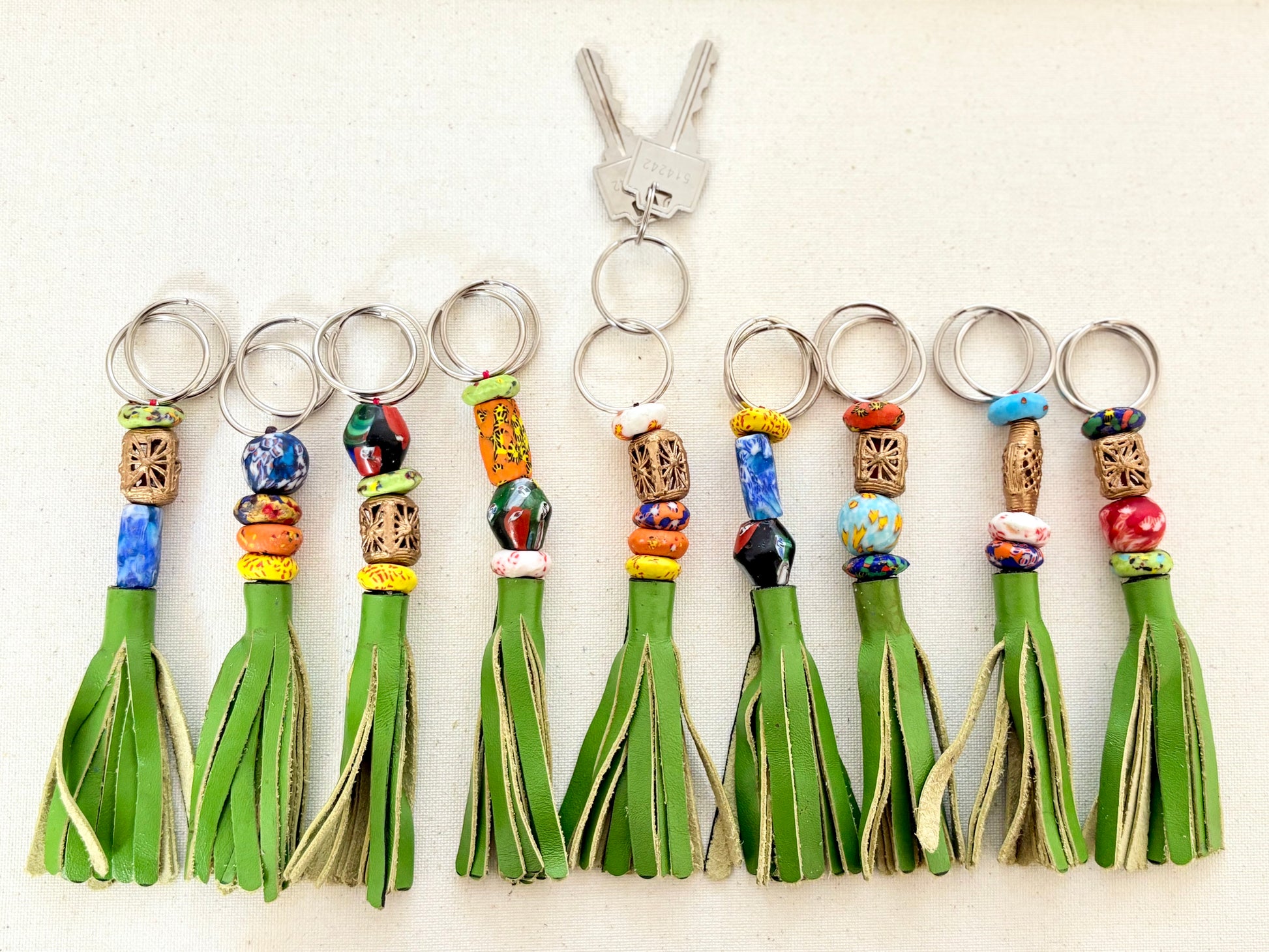 Our recycled glass beads, Leather, and Lost Wax brass keychains. Sold in a variety of colorful Ghana trade beads.